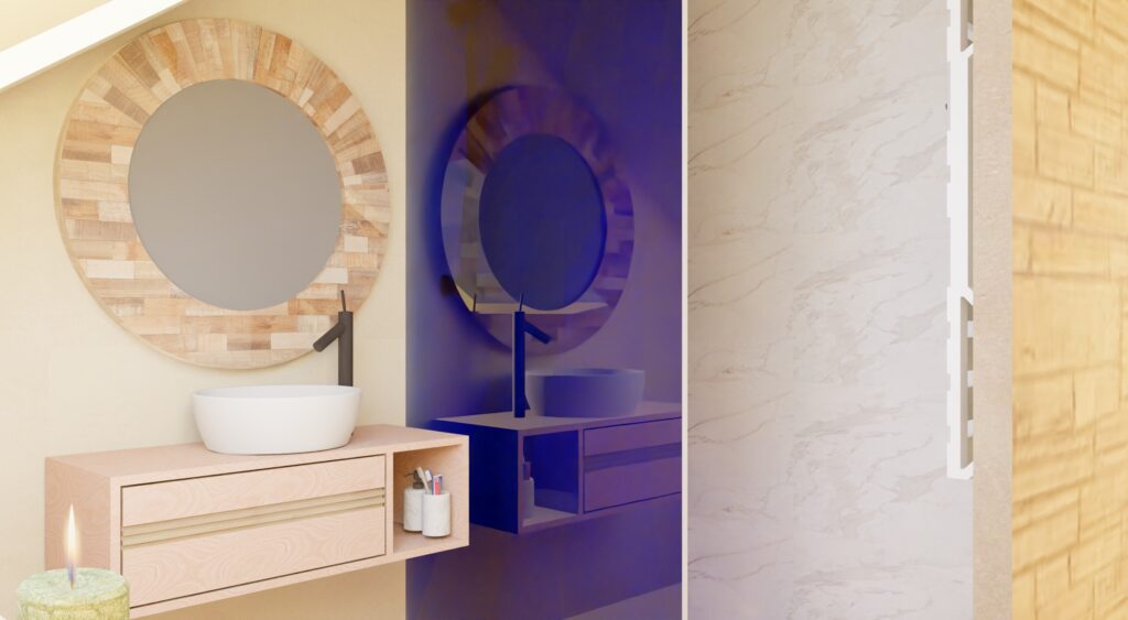 Dans ce projet, j’ai accompagné la cliente dans le choix des matériaux et des couleurs afin de créer une harmonie apaisante pour cette chambre. Le choix des accessoires n’est pas à négliger, puisqu’ils apportent la touche finale à cette décoration. Les couleurs beige et havane apportent de la chaleur à l’espace et sont réhaussées par l’utilisation du bois et des accessoires de décoration verts pour une touche naturelle.